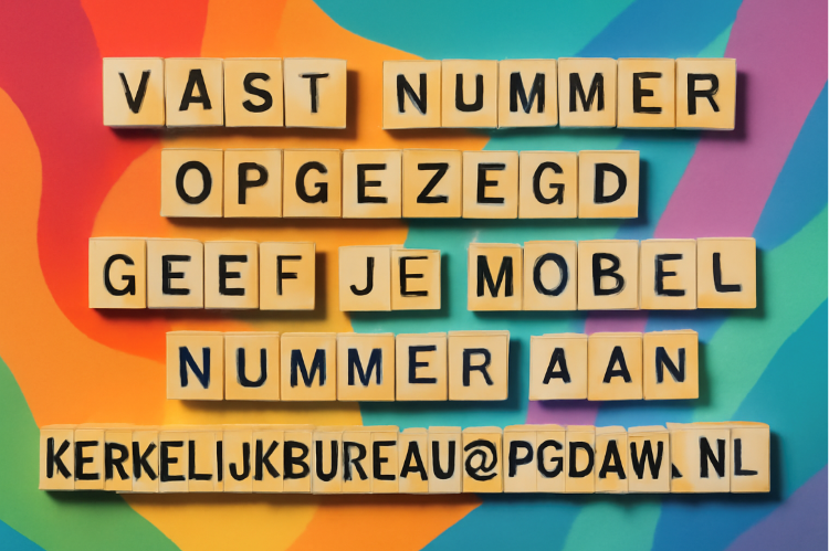 Het kan zijn dat we je niet meer kunnen bereiken, omdat we vaker tegen "Dit nummer is niet in gebruik" aanlopen. Daarnaast hebben we van veel kerkleden geen e-mailadres om je te bereiken. Wil je ons je nieuwe mobiele nummer doorgeven? Stuur dan een berichtje naar kerkelijkbureau@pgdaw.nl. Alvast bedankt!