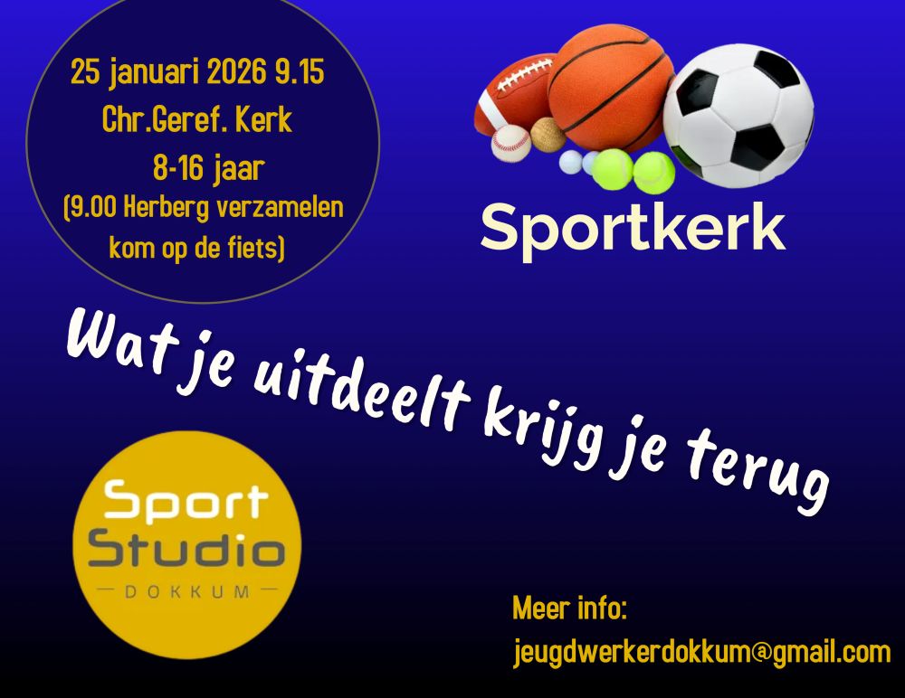 Op zondag 25 januari is er weer een sportkerk. Deze keer vanuit de Christelijk Gereformeerde Kerk. We verzamelen om 9:00 uur bij de Herberg. (De dienst in de CGK begint om 9:15 uur) Kom op de fiets, neem sportkleren mee. We gaan deze keer naar Sportstudio. Wat we daar gaan doen blijft nog even een verrassing.