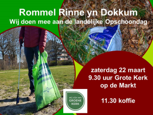 Op zaterdag 22 maart is het landelijke Opschoondag. Overal in Nederland gaan mensen de straat op om afval op te ruimen. Zo maken ze hun eigen omgeving schoner. Vanuit de zorg voor de schepping doet de werkgroep Groene Kerk van de Protestantse Gemeente Dokkum-Aalsum-Wetsens ook mee. De groep werkt hierbij samen met de werkgroep Groene Kerk van de Doopsgezinde Remonstrantse Gemeente in Dokkum en plaatselijke leden van de Partij voor de Dieren. Gemeente Noardeast-Fryslân zorgt voor materialen zoals grijpers, afvalzakken en hesjes. Met elkaar maken we Dokkum schoner. Verzamelplek is de Grote Kerk op de Markt waar we om 9.30 uur bij elkaar komen. Om 11.30 uur is er koffie/thee en koek in de Grote Kerk. | ||